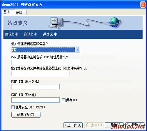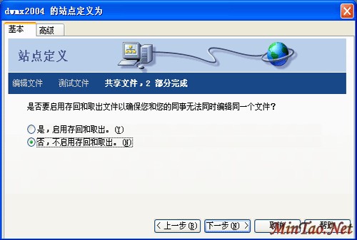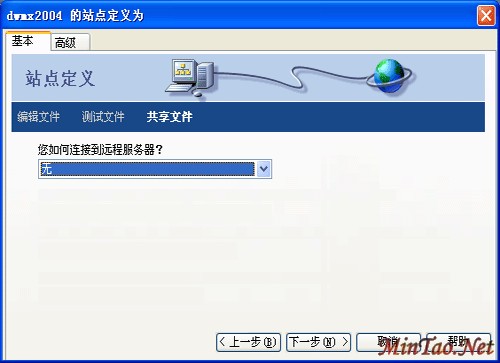 单击对话框顶部的“基本”选项卡。在前面“设置站点”时,已填写了“基本”选项卡中的前几个步骤,因此单击几次“下一步”,直到向导顶部高亮显示“共享文件”步骤。如下图: