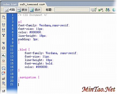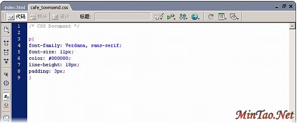单击 cafe_townsend.css 文件以显示该文件。您将看到,Dreamweaver 已经将您指定的所有属性添加到该文件中。