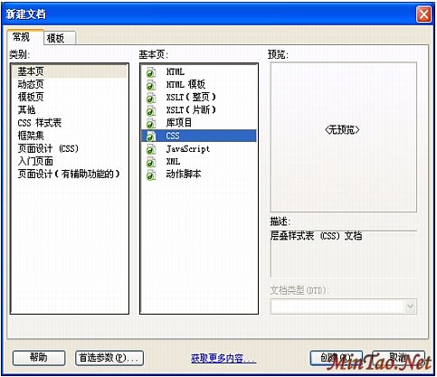 在"新建文档"对话框中的"类别"列中选择"基本页",在"基本页"列中选择"CSS",然后单击"创建"。