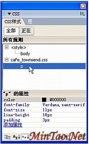 在"所有"模式下,CSS 面板向您显示应用到当前文档的所有 CSS 规则,不管这些规则是在外部样式表中,还是在自身文档中。您应在"所有规则"窗格中看到两个主要类别:一个<STYLE> 标签类别和一个 cafe_townsend.css 类别。