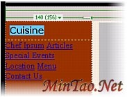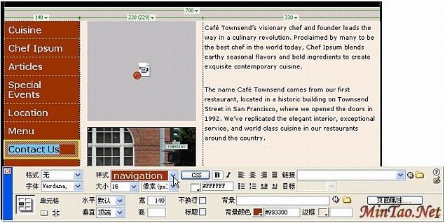 在"文档"窗口中,Cuisine 文本的外观完全发生了变化。根据您在上一节中为 .navigation 规则所定义的属性,该文本的格式现在已被设置为导航条按钮。