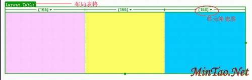 现在看我们的表格左上角有一个绿色的layout table标签,它代表着你这个表格。标签中有三个空白部份且每一个都标明了宽度且有一个小三角形。在这个表格中,我希望我的表格最左边的列固定,而整个表格适合浏览器的宽度。在dreamweaver4之前,这是非常困难的。我们能将表格设为100%来使它适合浏览器的宽度,但我们要想要固定某个单元格却相当困难。但是现在你只需要决定表格中哪一部份是你想固定的,哪一部份是你想伸展的就行了。唯一要记住的是,我们只能让一列自动伸展!!
