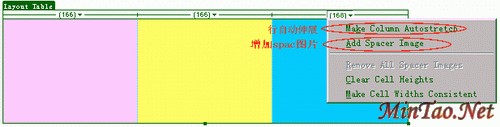 如果你用过macromedia公司的另一个产品fireworks,你一定知道fireworks也能生成html文件,但它也总会产生1个像素的gif图片,这个图片是用以填充你表格的空白区域,使你的表格不会变形。现在dreamweaver4也有了这项功能,它能自动生成一个名为spacer的gif图片来填充你的表格,使你的表格不会发生自动伸缩的现象。