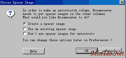由于是一个新站点,这时将出现一个对话框,提示你为了能够使行伸展,dreamweaver需要放置一些spacer图片在另一些行里。下面有三个选项: