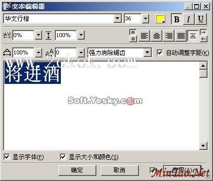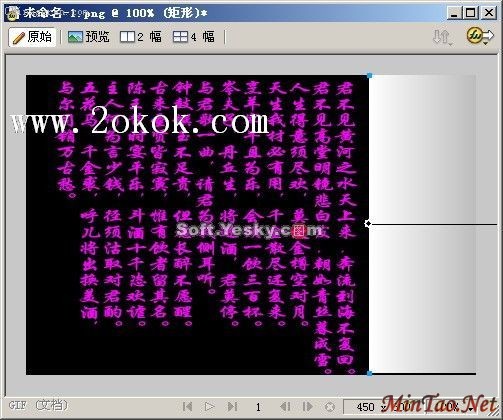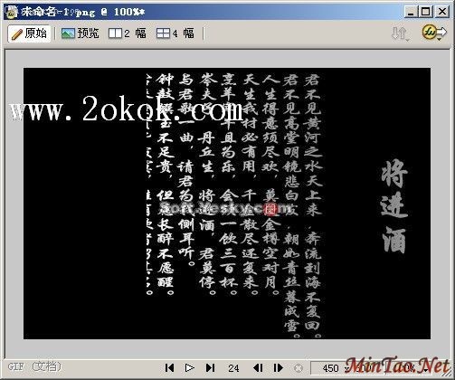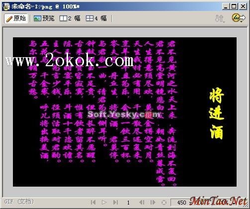 本实例模仿了一些影片片头的文字一行行显现,并且亮度、颜色不断改变的动画效果。这里,我们综合应用了渐层色、文字遮罩和动画等多种技巧,制作了李白的“将进酒”诗句从右到左逐行显示,亮度不断变幻的效果。 完成效果如下: 具体制作步骤如下: 1) 创建一个新文档,宽为450像素,高为300像素,背景色为黑色。 2) 在文档窗口中使用文本工具书写“将进酒”三个字,颜色为黄色,字号为36,其他设置如图1所示。