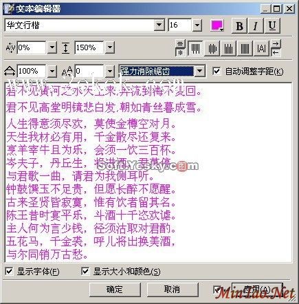 3) 再用文本工具书写侠客行的诗词内容,注意行文顺序从右到左,颜色为紫色,字号为16,其他设置如图2所示。