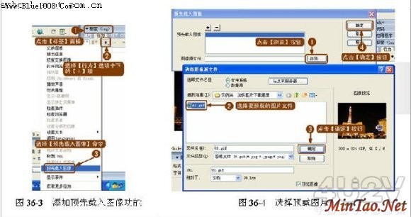 ( 2 )保存页面并插入图片。为了在插入图片时不提示相对路径,先保存页面为“ 36.htm ”。然后插入要预载的图片,如图 36-2 所示。
