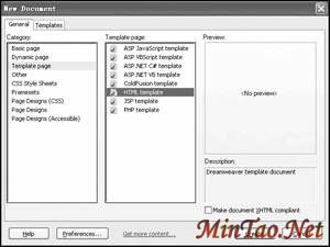 第一步:先在Dreamweaver MX 2004中运行“File→New”命令,接着从图1所示的窗口中依次选定“Template page→HTML template”选项,点击“Create”按钮之后即可创建一个模板文件。