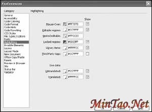 在打开的模板中,无法编辑的区域将呈高亮状态显示,但是有些位置是锁定区域,却不是高亮显示,这主要是因为图片正好盖住了背景的颜色。对于这种情况,可以运行“Edit→Preferences”命令,在弹出窗口的“Category”列表中选取“Highlighting”一项,接着在右部区域中选取“Locked regions”旁边的“Show”选项(图4),并且设定高亮显示色为蓝色,这样就可以很清楚地分辨出模板中的锁定区域了。