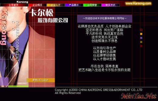 本网站设计的指导思想是在网络上营造一个优雅、高贵、宁静的氛围,为了体现这一主题,设计者将纹理、景深、光影、基调与有形的模特照片和静态的文字结合起来,更多的使用直线、坚硬的边缘、暗的色调来组成网站界面。页面中以较大面积的男性模特图片突出男式服饰这一主题,以穿插的直线段体现一种服装纹理的感觉。公司的名称则以一种柔软光滑的粗倩体来表现,以打破整个页面的坚硬感,同时以白色突出企业名称,达到非常亮眼的感觉。