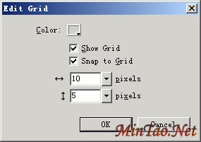 下面我们将根据上述设计分析,分不同的部分为您介绍制作过程。在新建一个文件后,我们需要对我们的工作环境进行简单的设定,以符合我们的任务要求。首先需要设定工作区的面积及背景颜色,打开Modify>Canvas Size针对常见的800x600分辨率,我们设定工作区的长为776这可以根据需要设定,但最好不要超过778,高为515根据实际内容确定,再执行Modify>Canvas Color设定背景色为黑色。再打开View>Grid>Edit Grid对话框,设定水平方向网格间距为10像素,垂直方向为5像素,并将网格颜色设为暗灰色以不影响观察页面,打开网格显示和网格捕捉。如下图所示: