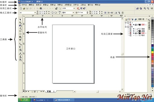 CorelDRAW 的工作环境所默认的页面版式是采用一种国际上广泛使用的A4办公用纸,这种纸张是面向于办公室而非针对书册杂志的版式,故我们在使用CorelDRAW进行书册杂志的排版工作之时,必须对这种版面进行一些设置,当然,我们也可以完全不管这种纸张的存在,而采用另一种更好的方法来处理我们所要进行的工作环境设置,那就是采用一些矩形框来从视觉上代表我们所想要的实际纸张要求。 在本文中所介绍的方法,并不是按照CorelDRAW软件本身所要求的排版方式来进行的,而是本人根据所从事过的印前工作个人经验总结而来,目的是希望能对一些从事印前工作的制作人员进行抛砖引玉,为各位读者朋友开辟出另一条排版之路。故此如有对本文的排版方式持怀疑态度的读者朋友,不必要进行一些无谓的猜疑,而是完全可以根据本文所介绍的方法,结合自己在实际工作中的实践体会,寻找出更加适合自己的排版方式,当然,本文所介绍的排版方法相信更是适合一些刚从事印前工作的初学人员。 对于准备参考本文采用CorelDRAW进行书册杂志排版的读者朋友,本文没有任何技术前提,仅要求读者朋友会从Windows的开始→程序菜单中调出CorelDRAW程序即可。 CorelDRAW打开后新建立的是一个和Word等办公类软件相类似的桌面窗口,如图1,不同的只是一些菜单项和工具而已。