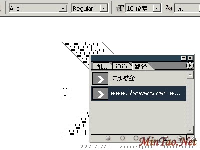 需要注意的是: 我们并不是在第一个文字的基础上制作的 在路径面板可以看到 当选择www.zhaopeng.net这个文字路径时,是无法沿路径排列的(光标不会变化) 而只有当选择了最初的路径时才可以进行 这样制作出来的第二个文字效果,与第一个文字效果是没有关系的 它们在图层面板中位于两个独立的层