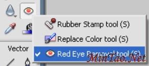*使用红眼移除工具* FWMX04的红眼移除新工具位于工具条上, 与橡皮图章工具和颜色替换工具属同一组。 在这个群组中颜色替换工具是默认的使用工具。 点选并按住颜色替换工具可以看到弹出的红眼移除工具, 然后移动鼠标进行切换使用。