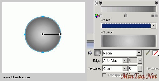选择圆形工具,按住shift 键,在画面中,画一个正圆形,然后选择填充工具,在属性面板上,把填充方式改为 radial,并且编辑填充样式如图,这个填充样式包括四个控制颜色点,详细的制作你的填充样式,是你仿真成功的要点。我这个样式的主要功能是打出底色,并且把小球的反光也铺出来。