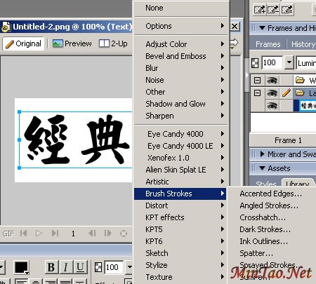 如果你的Fireworks挂上了Photoshop的滤镜(5.5以下版本)利用属性面版上添加效果(Effects+)就可以调用这里我们先选外框笔刷(Brush Strokes)