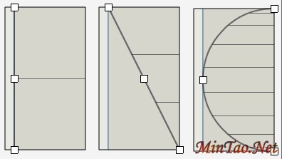轮廓面板给你提供了改变原型对象外轮廓的途径,轮廓描绘了造型沿轴向的变化,它由三个点控制。通过改变这三个点,你可以塑造你的对象外观。作为一个参考,你的轴向分割线可以在此面板预览,下面的外轮廓分别描绘了1)矩形;2)圆锥形;3)球形。