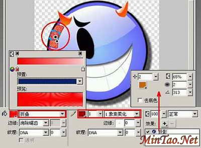 11.接下来我们给这个小魔鬼来个装饰品,给他带一个“创可贴”吧!嘻嘻(搞怪宝宝也经常搞的自己受点小伤)。新建一层分别用钢笔工具画出创可贴的两部分,其填充类别为“折叠”,其颜色设置中,左边色标颜色代码为#FF0000,右边色标颜色为#FFCCCC。描边种类为“1象素柔化”,绘制完后将这两部分选中组合,然后再添加投影效果,这个效果可以随个人喜好所定。