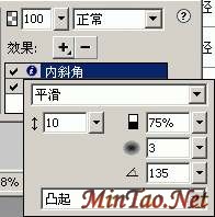 “内斜角”设置参数:斜角边缘形状为“平滑”、对比度为75%、柔化为3、角度为135、距离为10,按钮预设为“凸起”。