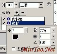 “投影”设置参数:距离为7、透明度为65%、柔化为4、角度为315。