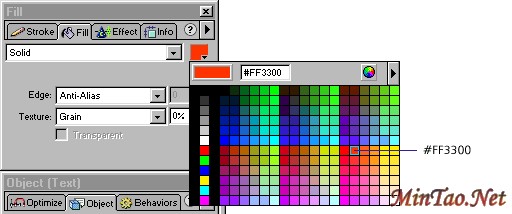 创建翻转效果 1,单击按钮编辑器的滑过(Over)标签然后单击复制弹起图像( Copy Up Graphic)按钮。在滑过(Over)标签中的图像是指在已完成的网页中当鼠标指针滑过这个按钮时显示的图像。 2,选中文字,使用fill(填充)面板,将文字变为红色。 3,关闭按钮编辑器 记得要经常的保存你的工作哦