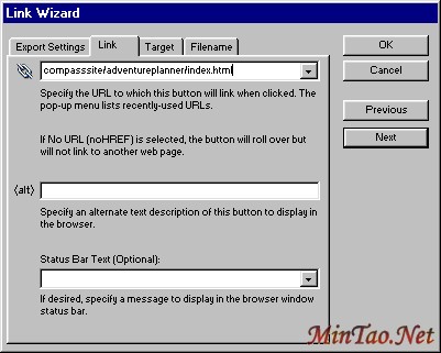预览一下 1,点击工具面板下面的隐藏切片图标,就可以隐藏掉按钮上覆盖的绿色。 2,点击preview标签, 3,把鼠标移到按钮上面就可以看到变色的效果了。 给按钮加上链接 1,点击Object面板上的 Link Wizard (链接向导) 2,在Link Wizard (链接向导)上的link标签上输入链接地址。