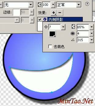 5.接下来给这个嘴巴加上“内侧阴影”效果,其效果设置距离为7,透明度为65%、柔化为4、角度为315,颜色为黑色,经过这样的加工,就显出嘴巴的效果来了。