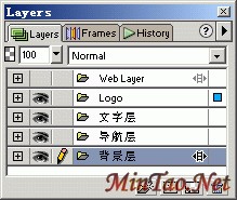 1、 在层面板新建一个Logo层,将其置于Web Layer层下方。 2、 我们需要将背景层修改为一个共享图层,打开层面板,切换到背景层,在弹出菜单中选择Share This Layer,将背景层共享,此层上的内容将在所有帧都可见,此层的后面将出现一个共享图标,如下图: