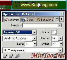 6、 打开优化面板Optimize设定此切片的类型为“Animated GIF”,颜色数为32,如下图所示: