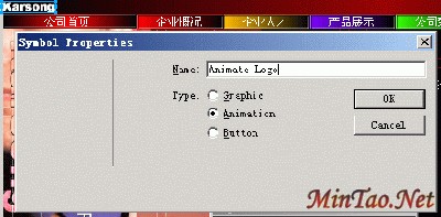 1、 在文档左上角新增一个切片,点击工具面板最下方的 按钮关闭切片显示[点击旁边的 按钮可以打开切片显示]。 2、 在层面板中切换到Logo层,在刚才的左上角位置处输入文字“Karsong”。 3、 选择此文字对象,按F8快捷键将其转换为一个动画符号,将其命名为“Animate Logo”,符号类型为“Animation”,如下图所示: