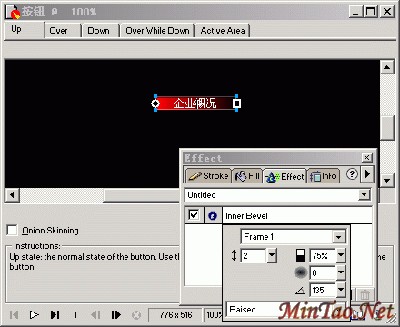 3、 此时的按钮符号只具有基本的外形,双击刚创建好的这个符号,打开按钮编辑窗口。 4、 常见按钮的Up状态,在按钮编辑器的Up窗口我们可以向编辑普通对象一样,为按钮增加一些特效。打开Effect面板,为此按钮矩形增加Inner Bevel特效,类型为Frame,如图所示: