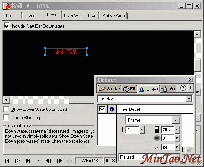 7、 需要注意的是,在按钮的Down状态下,需要取消对“Show Down State Upon Load”的勾选,同时要保证“Include Nav Bar Down state”被勾选,这可以使将来输出时会根据不同的按钮按下情况输出相应的HTML文件。 8、 关闭按钮编辑窗口,按钮的一个实例已经放置在了文档当中。