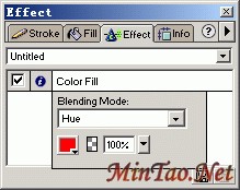 1、 我们先对上面创建好的按钮实例增加一种特效,打开Effect面板,选择Adjust Color>Color Fill,设定此特效的混合模式为Hue色调,如下图所示: