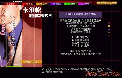 整个网站采用统一的结构,分为上下两个部分,上面为网站的导航条,下面左边以不同的男式服饰图片及文字标题表示各页主题。右边为内容区,以深色带条纹的图片作为背景。