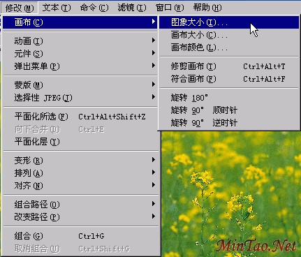 2.打开“修改”菜单,单击“画布”里的“图象大小”。