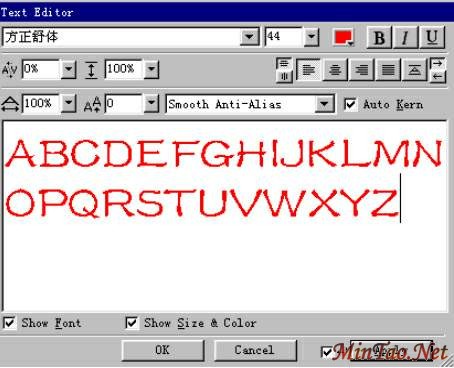 1.打开Fireworks软件,点“File→New”,设置好文件的大小及颜色(一般用Transparent),点击“OK”,新建一个Fireworks文件。.选择工具箱中的文本工具 ,在绘图区单击,在弹出的Text Editor文本编辑器中输入文字,并设定文字的字体、字号及颜色,点击“OK”。