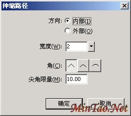 14、选中编辑区的对象,按“Ctrl+Shift+D”键,克隆它。选择菜单命令“修改|改变路径|伸缩路径”,在弹出的“伸缩路径”设置框中进行如下图所示的相关设定:将方向设为“内部”;宽度设为“2”;角选择第一个直角方式,设定完毕单击确定按钮即可。