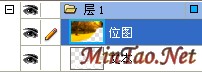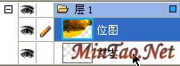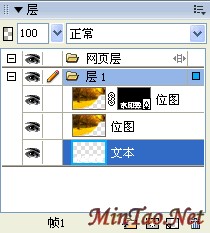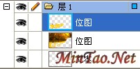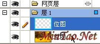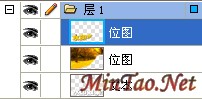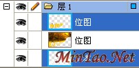 8、选中位于上层的文本对象,按“Ctrl+X”键,剪切它,选中位于上层的位图对象,选择菜单命令“修改|蒙版|粘贴为蒙版”,在编辑区上此时看不出有任何变化,但是层面板上已经发生变化了。选中剩下的文本对象,将其拖动到层面板的最下层,此刻层面板的对象排列应该如下图所示。