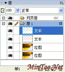 7、分别(或同时)选定编辑区的位图对象和文本对象,按“Ctrl+Shift”键克隆它们,此刻可以看到层面板上共有四个对象,如下图所示。