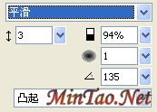 9、按Shift键同时选定蒙版对象层和文本对象层,执行属性面板上效果菜单命令中的“斜角和浮雕|凹入浮雕”命令,进行相关设定如下图所示。