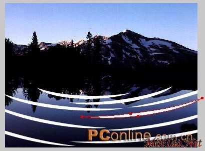 将两椭圆同时选中后使用“修改—组合路径—打孔”命令,一条涟漪的外形就出来了。再复制多若干条这样的涟漪外形,并用变形工具进行适当的拉宽及旋转不同的角度后,形成如图般的状态。