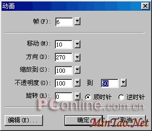 接着把背景层中的位图复制一份放到“层1”里面并用方向键使其上移2个像素。然后点击“修改—动画—选择动画”命令,在弹出的窗口里对该位图进行如下的各项动画设置。