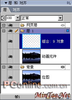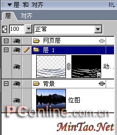 把“层1”里的两个对象层全部选中后,使用“修改—蒙版—组合为蒙版”命令,将两个对象层合成一个蒙版对象。