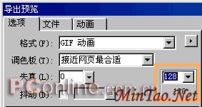至此整个水波涟漪的动画效果就完成了,如果你对动画的色彩要求不是很高的话,建议在点击“文件—导出预览”时,可将该GIF动画的使用色设为128,以减小动画文件的容量。如图: