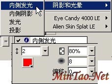 6.现在给大圆加上“内侧发光”效果,点击“属性栏”中的+号,选择“阴影和光晕”下的“内侧发光”,选择颜色(此颜色与刚开始设置这个圆渐变色中深色一样),宽度为2,不透明度为80%,柔化是8,偏移为0。