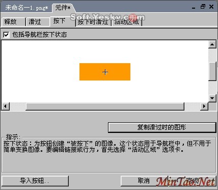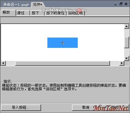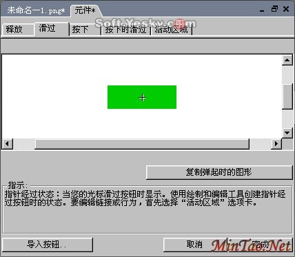 该窗口中前面的“释放”、“滑过”、“按下”和“按下时滑过”是用来设置鼠标在触及按钮时,按钮所呈现的四种状态。而“活动区域”则用来设置按钮在响应鼠标指针时的有效范围。
