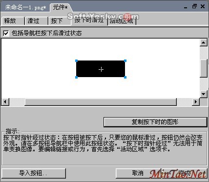 “按下时滑过”选项是设置按钮在被按过之后鼠标再次滑到按钮上时,按钮所呈现的形状。该项同样是在选中“包括导航栏按下状态”后才能生效。我们点击“复制按下时的图形”后,把上一帧的按钮色彩改为黑色,以便区别。