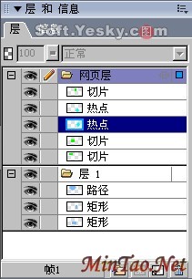 网页层:所有的“切片”和“热点”区域都被保存在“层”面板中的“网页层”内,以划分它们与图像层的区别。但同时也可以像对待图像层那样对网页层进行例如重命名、选择、删除、展开/折叠层、隐藏/显示层、锁定/编辑层等操作,如图10—01。