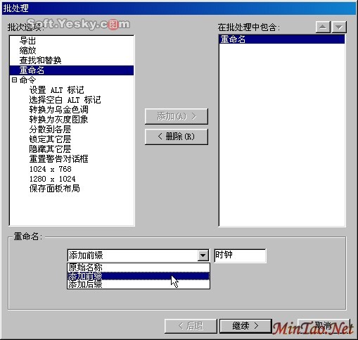 在该窗口的左边的“批次选项”中选择执行文件处理的动作后点击“添加”按钮,即可把动作加入到右边的列表中。一次可以添加多个处理动作,而且点击右边列表中的两个箭头按钮 ,还可以设置执行动作时的先后顺序。对于不需要的动作指令也可以从列表中选中后点击“删除”按钮。在这里我们试着把刚才导入的两张图片的原有名称面前加上“时钟”两字,然后点击“继续”按钮,进入下一个设置步骤。