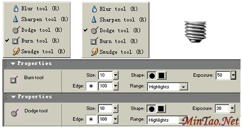 4.再分别用Fireworks MX提供的新功能 “Burn tool”和“Dodge tool”在适当的地方进行碳化和添加高光。在使用这两个工具时一定要调整好参数,下手要利落、干净,轻重也要掌握好,其实这步操作也是较麻烦的。经过这步操作后就有了金属螺旋的感觉,进行适当缩放。具体设置和效果如图: